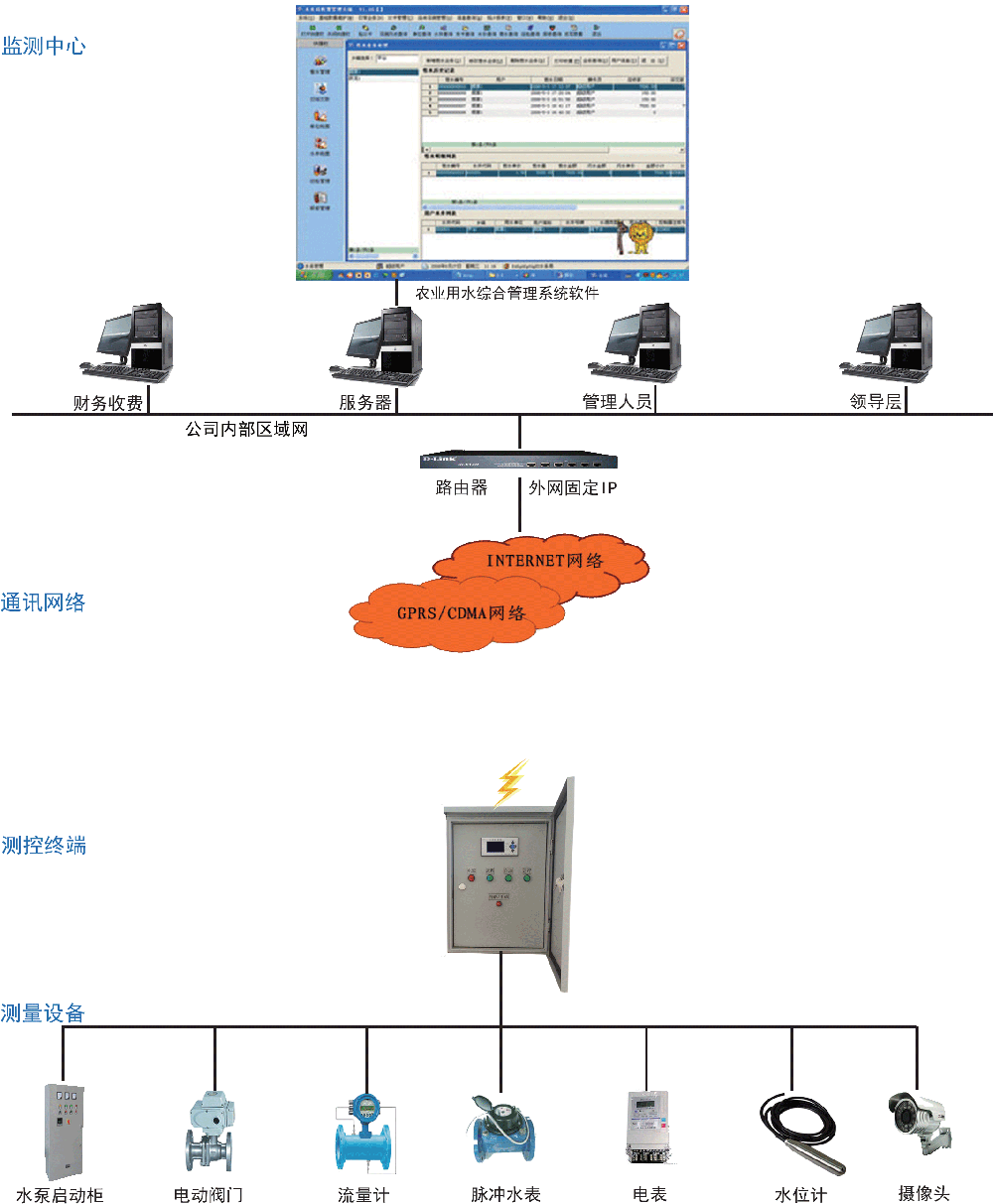 v 監(jiān)控中心:中心服務(wù)器、外網(wǎng)固定IP、水資源管理系統(tǒng)軟件、收費管理系統(tǒng)軟件;